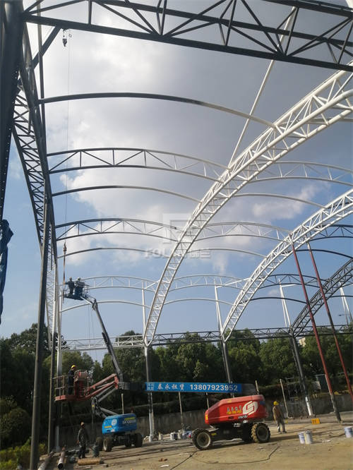 該項(xiàng)目坐落于九江濂溪區(qū)全民健身中心,占地面積約2400平方米,我司從今年5月上旬開(kāi)始拆除圍網(wǎng),并對(duì)球場(chǎng)進(jìn)行了基礎(chǔ)的挖深工作。7月底,佛蘭空間膜結(jié)構(gòu)有限公司工程項(xiàng)目團(tuán)隊(duì)人員不分晝夜,完成了鋼構(gòu)拼接、鋼構(gòu)吊裝、鋼構(gòu)除銹、膜材吊裝、膜材安裝等一系列操作,歷時(shí)一月余,九江白鹿網(wǎng)球場(chǎng)完美竣工。