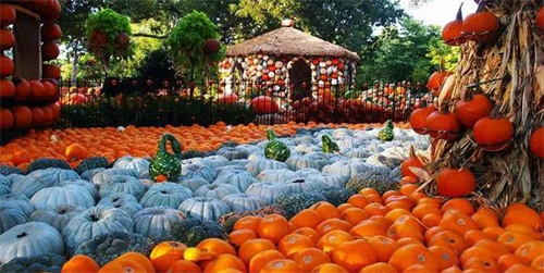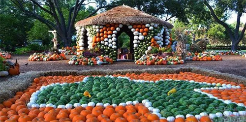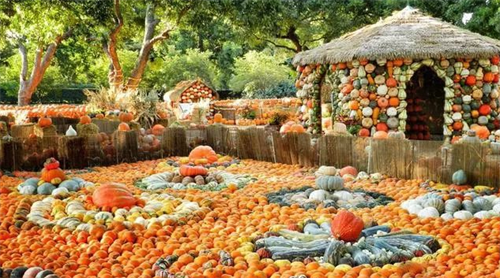 南瓜除了用于木雕,石雕,磚雕等,還能直接用于建造和裝飾房子。在美國達(dá)拉斯植物園,有一個叫羅里邁耶斯兒童冒險樂園的特色兒童游園,全場都用瓜果蔬菜打造,共計花了5000個南瓜。它不光用南瓜來建造房子,還用南瓜裝飾花園、街道,門廊等。整個兒童樂園,布滿了日常餐桌上的瓜果蔬菜,可讓孩子親近自然、熱愛自然。