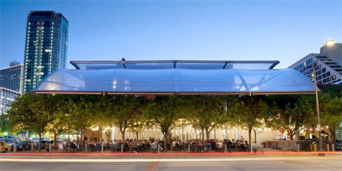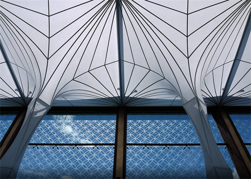 ETFE薄膜允許紫外線透射,可保證樹木健康生長,而在ETFE薄膜上印銀點就能為用餐者提供一定程度的陰影,最后結構頂部的通風口可以讓暖空氣逸出,樹木和用餐者都會很舒適。該餐廳膜結構形狀和跨度圍繞樹冠設計,ETFE材料的運用實現(xiàn)了人與自然的和諧相處。