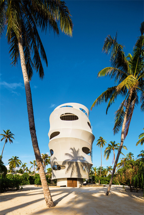 該獨特建筑位于馬爾代夫島,于2014年建成,和島上其他傳統(tǒng)建筑設計風格不同,該建筑采用了白色鏤空的膜結構立面,使得建筑超前、現(xiàn)代。