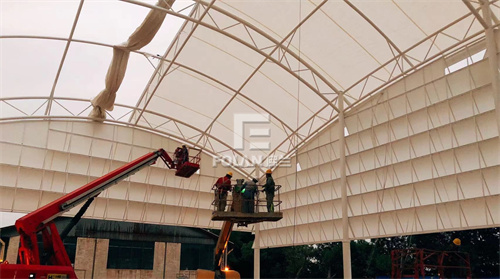 蒲公英風(fēng)雨網(wǎng)球場位于廣州市海珠區(qū),膜面積約1784平方米。項(xiàng)目人員進(jìn)場后,夜以繼日,辛苦施工,歷經(jīng)數(shù)月,完成了鋼結(jié)構(gòu)的制作加工、安裝,膜材的制作加工及安裝。