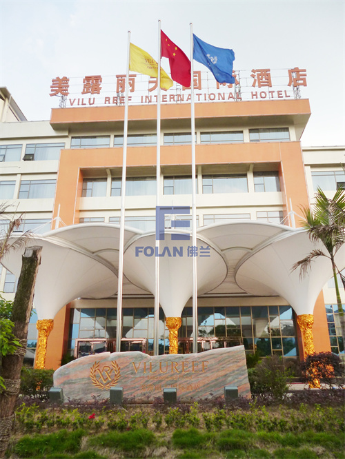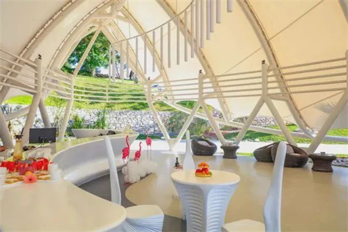 膜結(jié)構(gòu),憑其輕盈的結(jié)構(gòu),獨(dú)特的造型,已廣泛應(yīng)用于酒店建筑中,比如膜結(jié)構(gòu)酒店門頭、膜結(jié)構(gòu)建筑外墻、膜結(jié)構(gòu)屋頂以及膜結(jié)構(gòu)天花吊頂。酒店建筑運(yùn)用膜結(jié)構(gòu),不僅造型獨(dú)特,還能營造明亮、溫馨、別具一格的室內(nèi)環(huán)境。