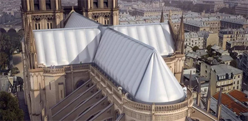 2019年,在巴黎圣母院屋頂線建筑競賽中,就有2個(gè)膜結(jié)構(gòu)建筑屋頂方案特別惹人眼球,膜結(jié)構(gòu)的運(yùn)用,使得莊嚴(yán)肅穆的教堂增添了些許現(xiàn)代時(shí)尚感。