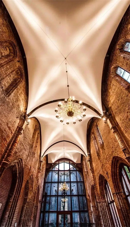 除了外部及屋頂,教堂內(nèi)部吊頂也會(huì)運(yùn)用膜結(jié)構(gòu)。膜材吊頂,既能吸音,又能起到裝飾作用,營造出舒適、溫馨、神圣的空間環(huán)境。