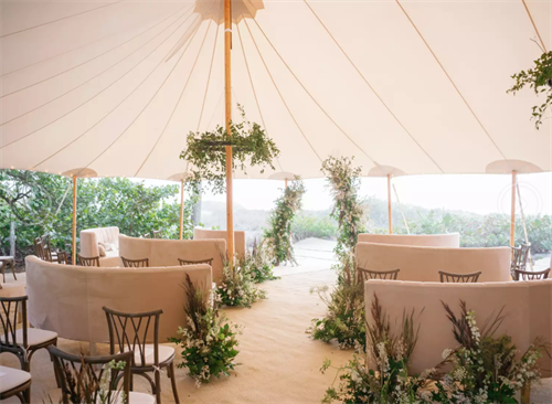 它搭建地點(diǎn)靈活,可選擇海邊,也可選擇平坦的草坪。此外,婚禮篷房的布置操控性也更大,婚禮篷房頂部可選用不同的膜材,有純白色的,也可以是紅色和其他您喜歡的顏色。另外,膜結(jié)構(gòu)婚禮篷房可搭配其他裝飾實(shí)現(xiàn)歐式、田園,中式等各種主題婚禮,靈活多變。