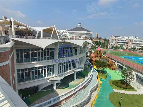 佛蘭空間設計和項目施工人員,經過結構優(yōu)化設計、變形分析、安裝措施及高精度測量控制,最大限度消除了安裝過程中可能帶來的結構的變形,保證了該幼兒園中庭膜結構的美觀性,同時還為小朋友玩耍提供了一個能遮陽擋雨的溫馨空間。