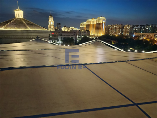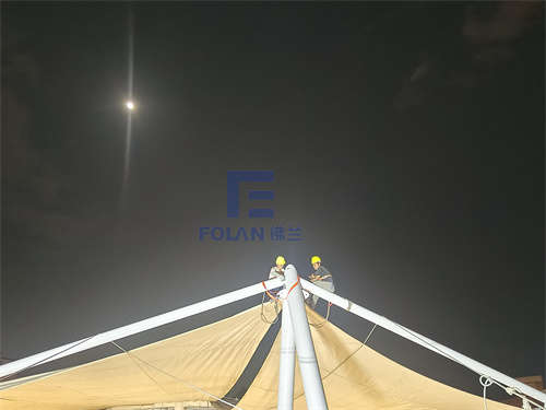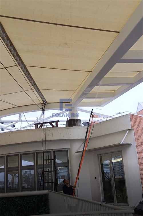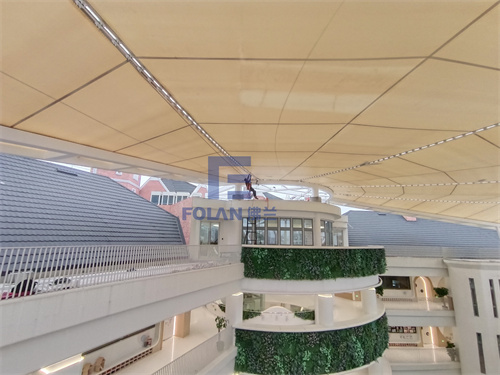 因幼兒園白天上課,所以項目只能周末和晚上施工,佛蘭空間項目施工人員趕工夜戰(zhàn),歷時20天完成了該扇形中庭膜結構的安裝。