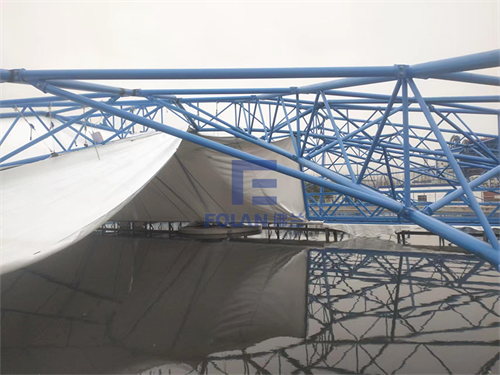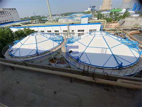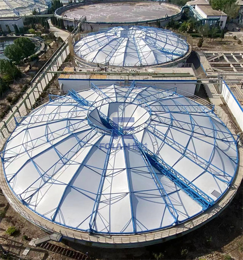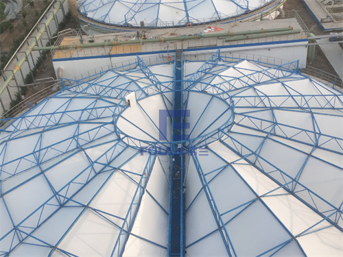 山東的4個污水池,采用鋼架式反吊膜加蓋方式,選用進口雙面PVDF抗酸堿、抗腐蝕膜材,以全新的技術(shù)實現(xiàn)鋼構(gòu)反吊安裝。