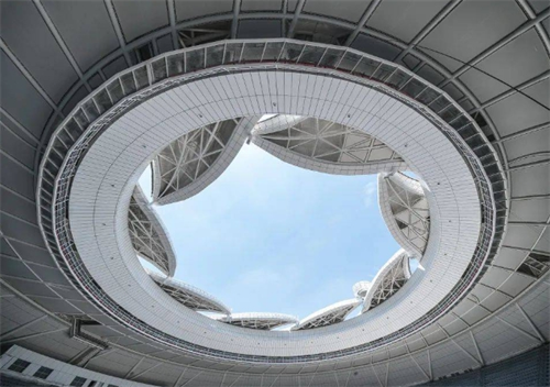 棒(壘)球體育文化中心設(shè)計中引人注目的則是球場上的云翼頂棚,既起到遮陽擋雨的作用,又展現(xiàn)出江南水鄉(xiāng)的地域特色。頂棚由雙向桁架系統(tǒng)支撐,覆蓋著涂有二氧化鈦的聚四氟乙烯(PTFE)薄膜,總面積達到2萬多平方米。表面呈現(xiàn)出微風(fēng)拂過水面泛起的漣漪效果,而在夜晚,LED燈光的照射下,天花板明亮通透,給觀眾帶來了一種獨特而舒適的觀賽體驗。