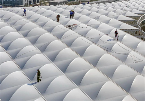 拱墅運河體育公園體育場建筑結(jié)構(gòu)采用三角管桁架結(jié)構(gòu)體系,“傘架”由鋼結(jié)構(gòu)構(gòu)成,“傘面邊緣”是一條80米的大鋼管,“傘面”的屋面膜選用PTFE膜,有輕便、高透光、自潔、獨特的光學(xué)性能等優(yōu)點。