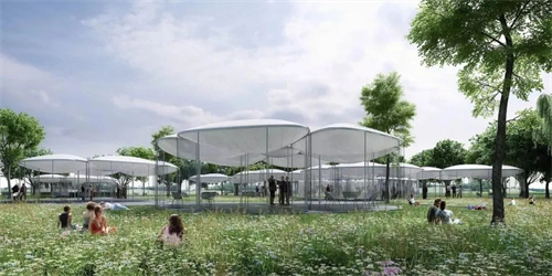 牽牛花造型雨傘膜結構建筑是一種低成本模塊化產品,可以在任何需要庇護的地方出現。這些獨立結構的花瓣無論是單獨還是概括起來,都為下面的活動和參與者提供了屋頂和空間組織。