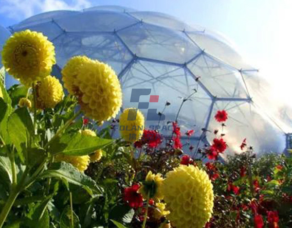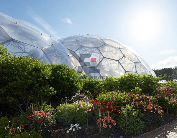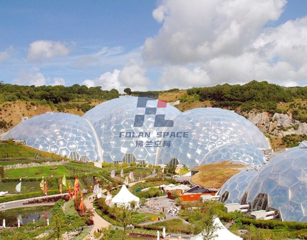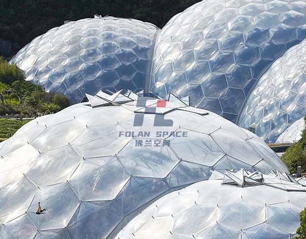目前世界上大的植物園,為ETFE充氣膜結構。整個建筑采用單層氣枕固定在主體鋼構外側,形狀多為六邊形。氣枕采用三層膜結構,外層厚度250μm,內層膜厚度為200μm,中間厚度為50μm。