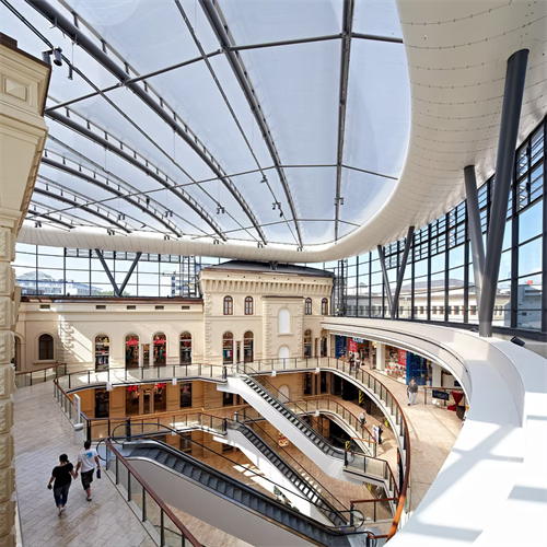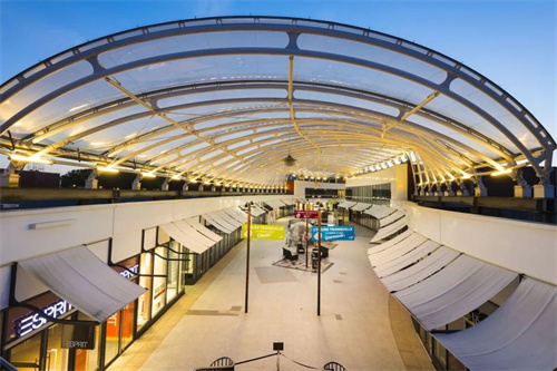 ▲零售店街道被ETFE氣枕系統(tǒng)覆蓋,營(yíng)造出迷人的透明屋頂,為游客提供輕松的購(gòu)物體驗(yàn)。