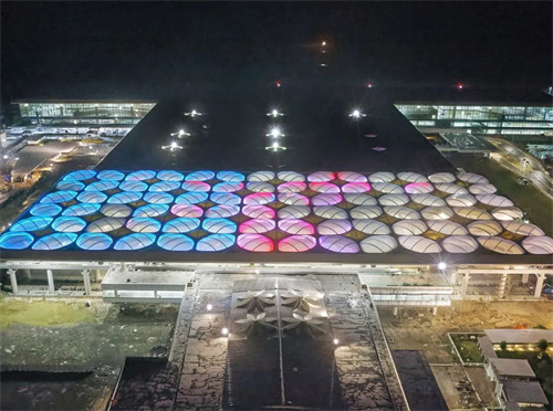 ▲14314平方米的屋頂,包括84個(gè)雙層氣枕,頂層有63%的印點(diǎn)圖案,能減少陽(yáng)光的穿透,為乘客提供下雨等天氣的保護(hù)。