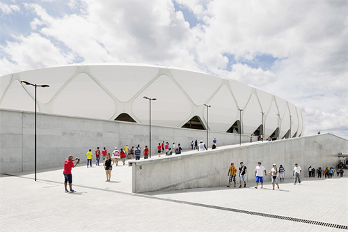 體育場頂棚是半開放式的PTFE膜結構,純白的顏色和獨特的造型引人注目,頂棚可遮蓋所有的席位,使游客坐在席位上觀看比賽免受日曬雨淋。