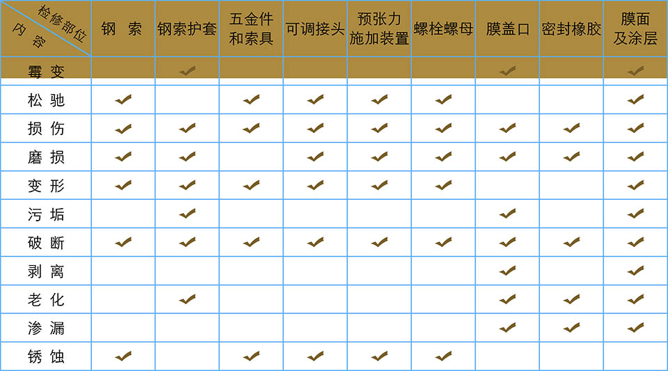 主要檢查項(xiàng)目有:膜材有無(wú)較大變形,膜材是否因預(yù)張力損失而松弛,膜材是否局部撕裂,膜材涂層是否剝離,拉索是否松動(dòng),油漆是否剝落等。