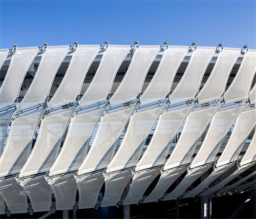 PTFE材料的半透明特性,創(chuàng)造出獨特的視覺對話。場外的人可以瞥見場內(nèi)活動的模糊光影,激發(fā)了好奇心與參與感;場內(nèi)觀眾則能透過表皮看到公園的綠意,緩解了大型建筑的封閉感。