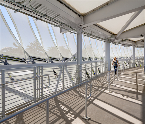 這種輕質(zhì)膜結(jié)構(gòu)與看臺樓梯的巧妙結(jié)合,引導(dǎo)觀眾在半透明的頂篷下自由移動,并能欣賞到校園和公園的壯麗景色,將體育競賽與休閑觀景完美結(jié)合,營造出輕松獨特的網(wǎng)球體驗。