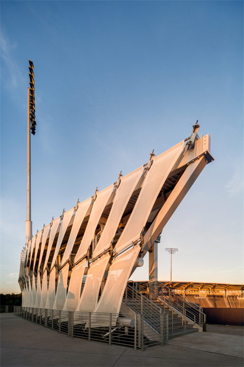 立面上樹葉般的圖案,讓體育場自然地融入了公園環(huán)境,同時其創(chuàng)新的形態(tài)和復(fù)雜的幾何結(jié)構(gòu),使其本身成為校園內(nèi)一個令人過目不忘的建筑標(biāo)志。