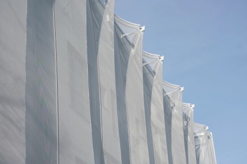 建筑主體為簡潔的混凝土立方體,外覆銀色PTFE網(wǎng)格膜系統(tǒng)。膜材如簾幕般呈波浪形環(huán)繞建筑,形成“柔軟織物”與“剛性幾何”的視覺對話。其半透明與反光特性,使建筑在不同時段呈現(xiàn)豐富的光影表情。