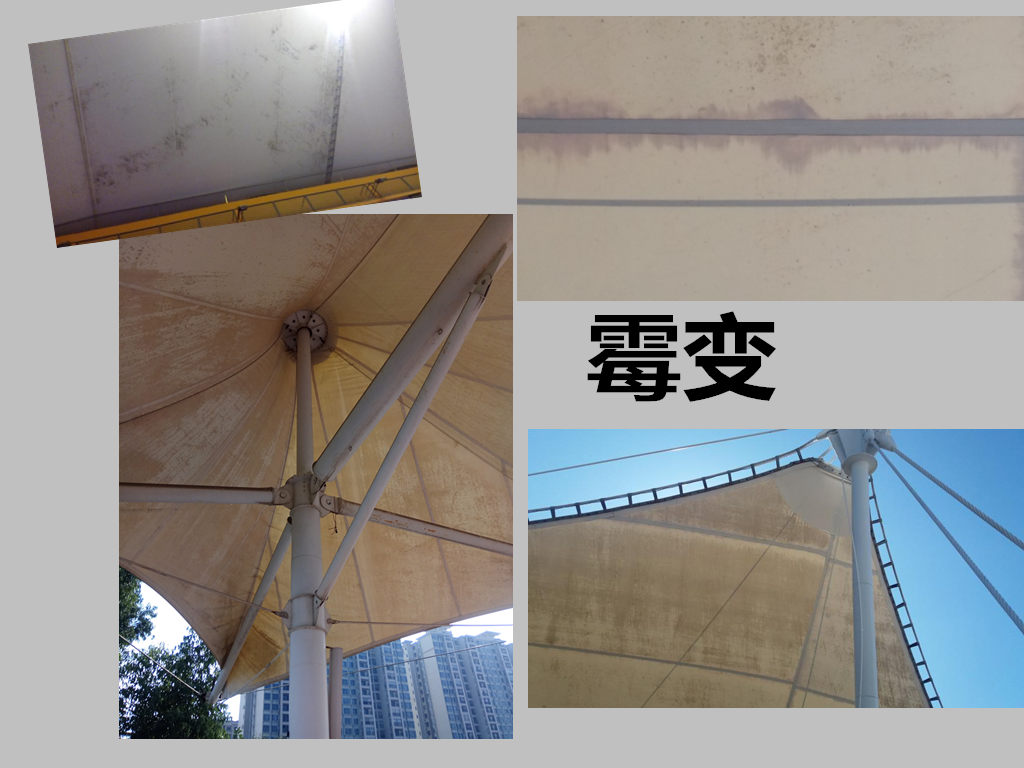 一些劣質(zhì)的膜材,往往通過少涂或者不涂自潔涂層,或涂刷其他材料(如清漆)等來降低生產(chǎn)成本,以達(dá)到低價(jià)競爭的目的。而客戶又很難通過肉眼去分辨膜材表面涂層是否被造假。一般,完工后1年左右,使用劣質(zhì)膜材的工程會(huì)出現(xiàn)膜體松動(dòng)、徐變,膜材出現(xiàn)霉斑、黑點(diǎn)、更有甚者會(huì)出現(xiàn)表涂層剝離脫落。3年后,霉斑連成片,膜基布里的絲霉斷,強(qiáng)度減弱,遇大風(fēng)一吹,形成破洞、裂縫,最終破損報(bào)廢。
