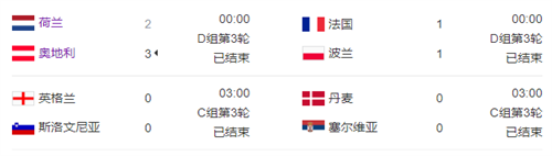 D組中,法國隊1-1與波蘭隊戰平,荷蘭隊2-3爆冷負于奧地利隊,奧地利隊力壓法荷二強獲得小組頭名,法國、荷蘭分列二三位出線。