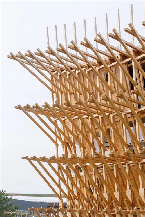 主體結構由3000根日本雪松木料交錯搭建,形成網格狀外立面,展現日本榫卯工藝與巴林傳統造船技術的結合。屋頂采用弧形設計,中部下凹、兩端翹起,模擬帆船輕盈形態,木椽延伸形成波浪狀輪廓,強化動態美感。
