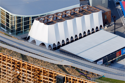 卡塔爾館,由隈研吾建筑都市設計事務所與卡塔爾博物館合作設計,造型宛如一艘傳統的單桅三角帆船(dhow),這種帆船曾是阿拉伯灣貿易和采珠業的重要工具。展館的白色弧形頂篷懸掛在精巧連接的木框架上,既像迎風招展的船帆,又像日本和卡塔爾木工工藝中那種富有張力的寧靜。