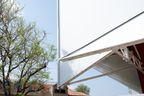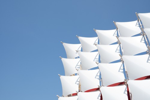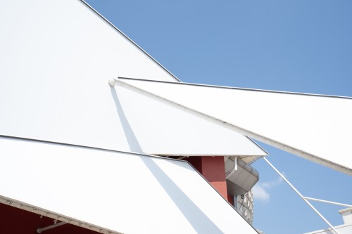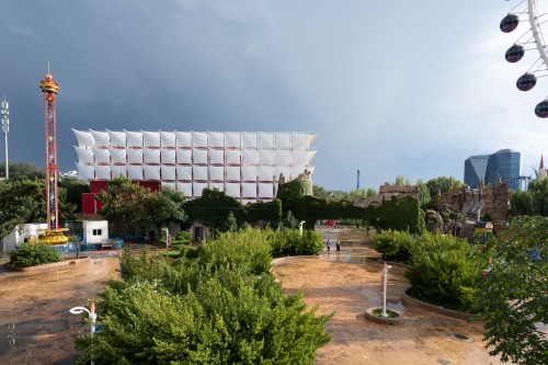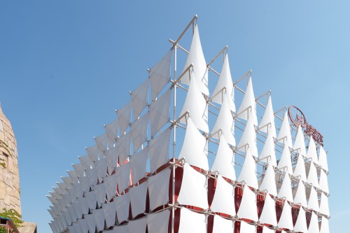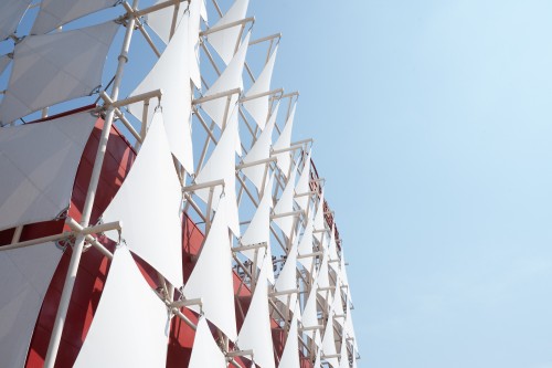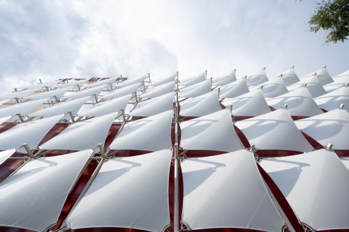 建筑采用了項目的主題色—紅色,先建造一個滿足建筑基本功能的體量,再通過在體量上疊加一個由膜材料構成的靈活形式,創(chuàng)造出一個動態(tài)形象,這樣處理,不但縮短了施工周期,還大大降低了項目成本。